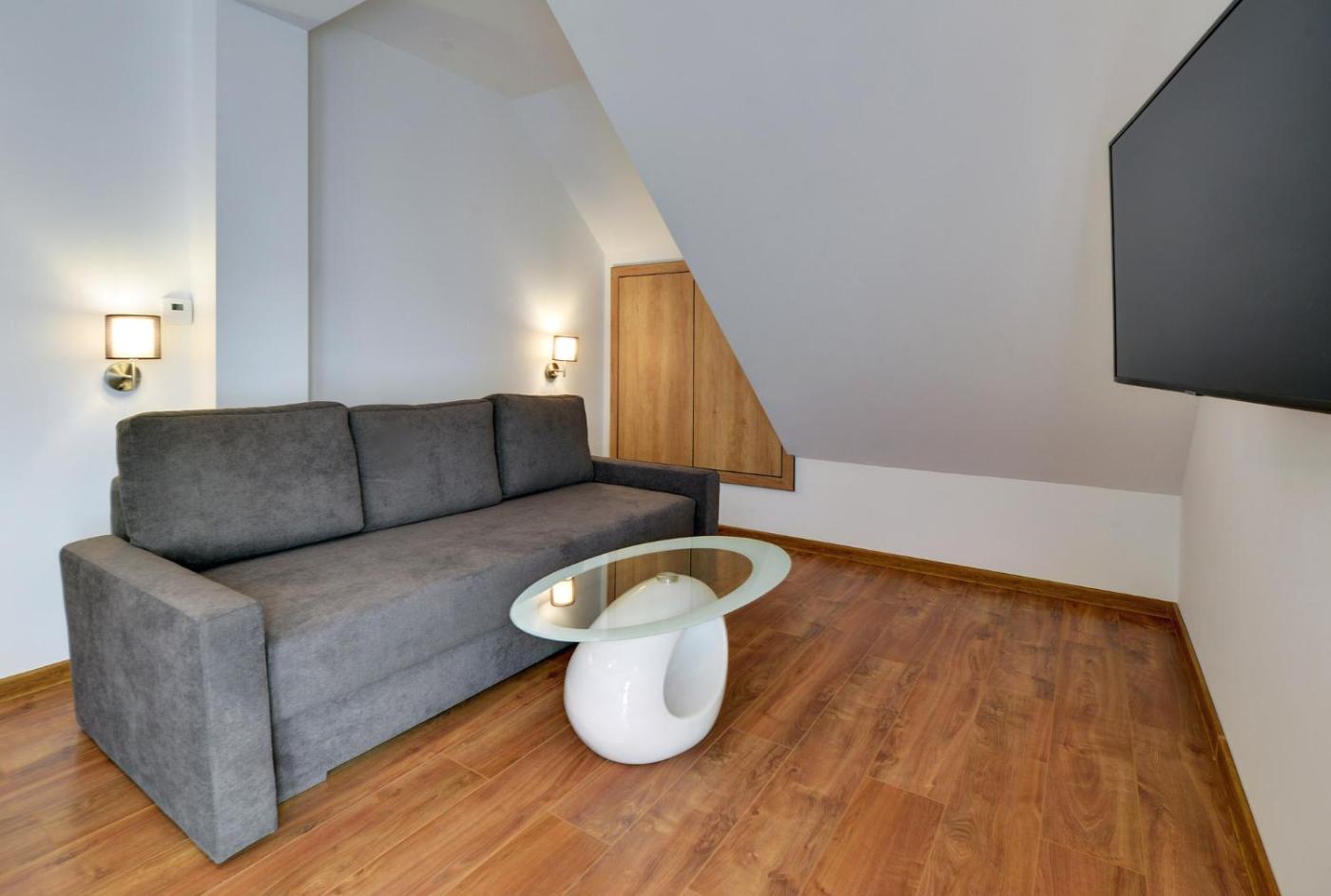 Apartament z prysznicem. The air-conditioned apartment has 1 bedroom and 1 bathroom with a shower and a hairdryer. The apartment features a flat-screen TV, a tea and coffee maker, a wardrobe, a sofa as well as city views. The unit has 3 beds. Apartament - 4 osobowy. Powierzchnia pokoju ok.: 29 mkw.