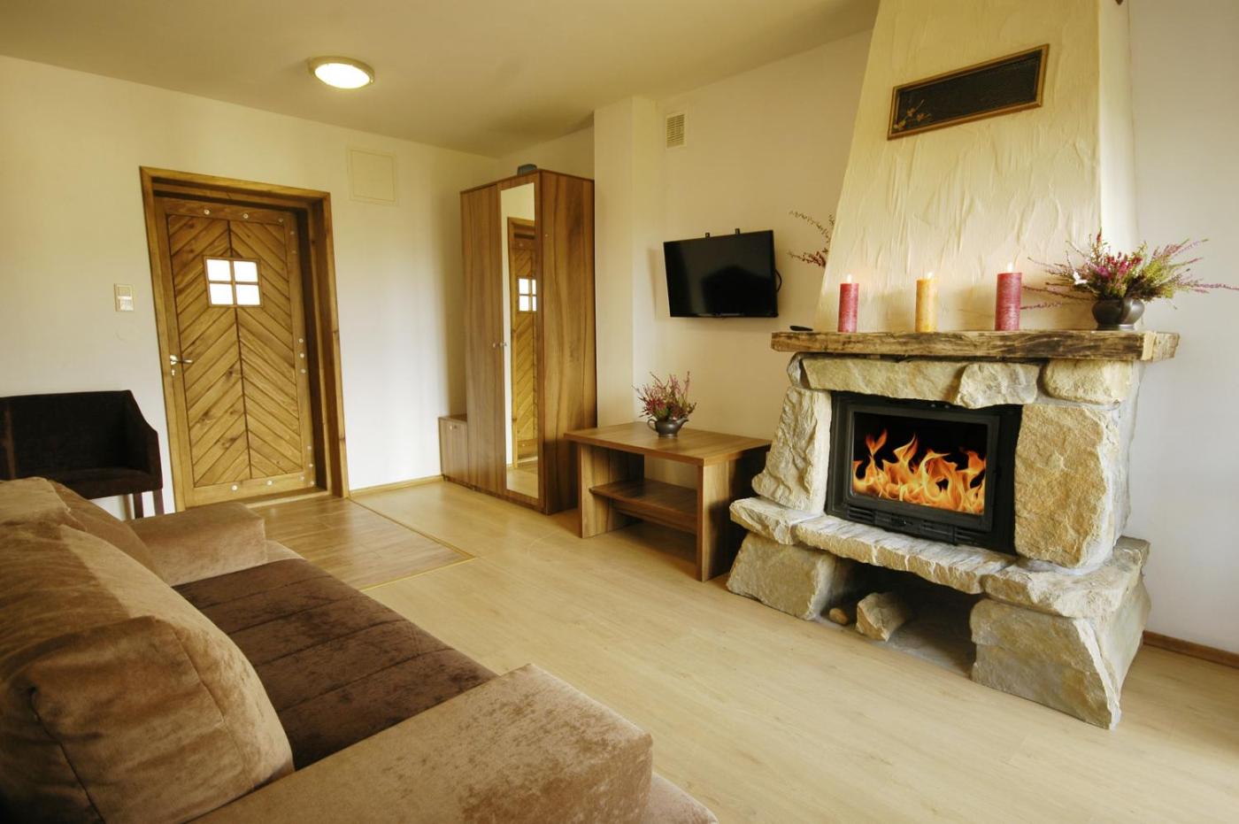 Apartament z kominkiem. Jest to apartament z kominkiem. Apartament mieści salon, oddzielną sypialnię oraz łazienkę z prysznicem. Udogodnienia w apartamencie obejmują aneks kuchenny z płytą kuchenną i lodówką, w którym można przygotowywać posiłki oraz przechowywać żywność. Ten apartament z tarasem wyposażony jest w szafę, czajnik elektryczny oraz telewizor z płaskim ekranem i dostępem do kanałów satelitarnych. W opcji zakwaterowania znajdują się 3 łóżka. Apartament - 5 osobowy. Powierzchnia pokoju ok.: 32 mkw. ;